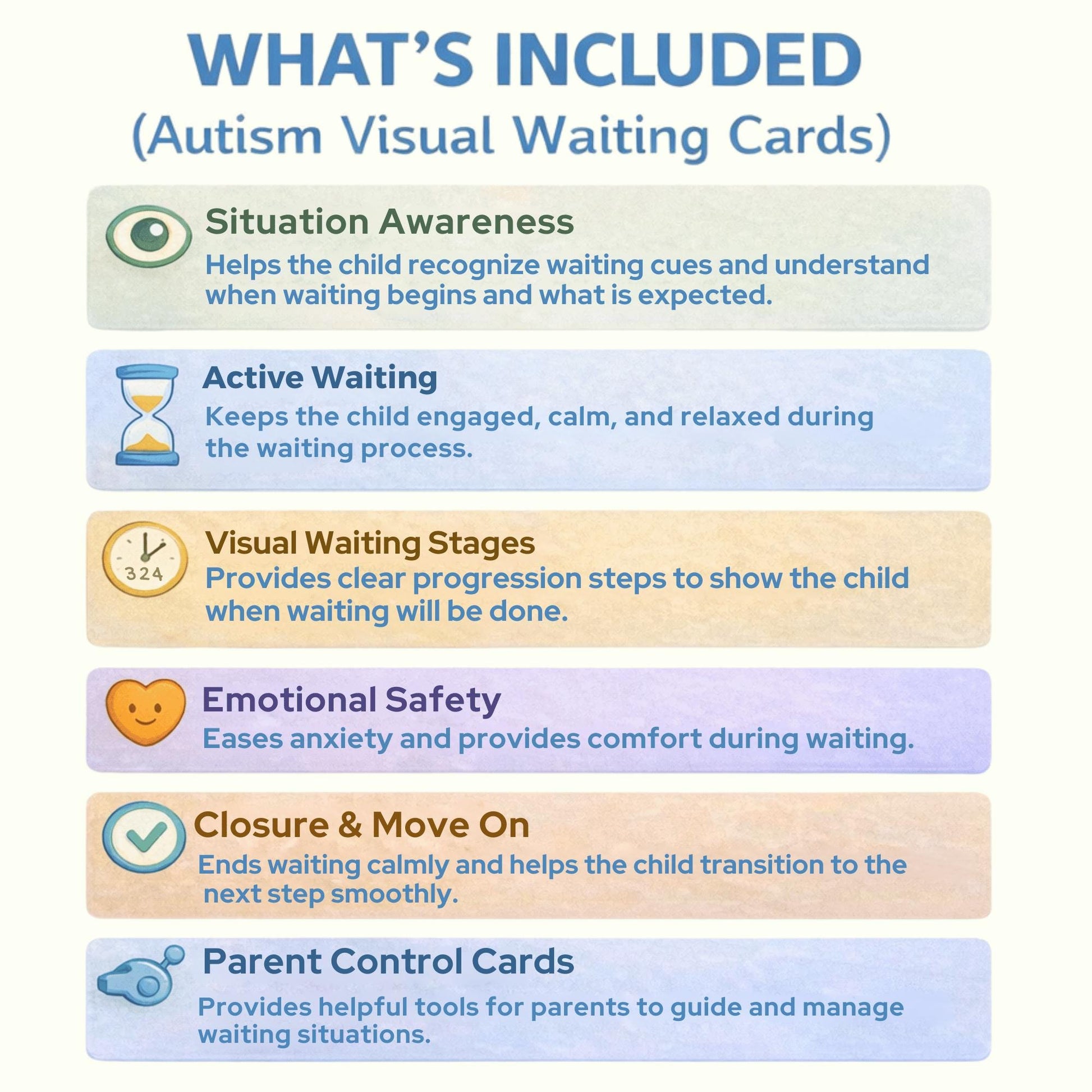 Helps the child understand the situation and feel safe. The cards reassure the child that waiting is temporary and nothing is wrong.